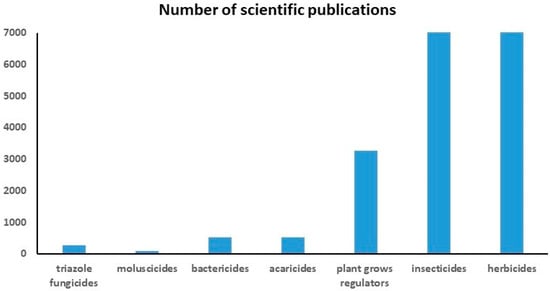 Number of scientific publications regarding the environmental effects of various pesticides found in the “Environment” section in the SpringerLink online collection in April 2021 (https://link-springer-com.am.e-nformation.ro/search?facet-discipline=%22Environment%22, accessed on 15 April 2021).