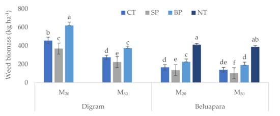 Effect of tillage practices and residue levels on the net weed dry biomass (kg ha-1) at 30 days after emergence from soil collected from Digram after 5 years and Beluapara after 3 years. Values are means of four replicates. The means for each site with similar letters (a−f) do not differ significantly at p ≤ 0.05. CT = conventional tillage, SP = strip planting, BP = bed planting, NT = no tillage, M20 = 20% residue, M50 = 50% residue. Whiskers mean the standard deviation.