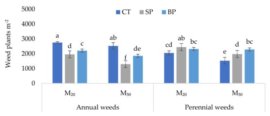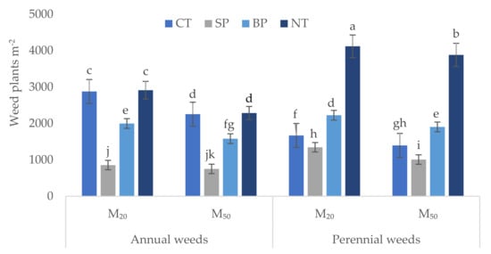Density of emerged annual and perennial weeds from topsoil (0–15 cm) at 30 days after emergence from soil collected from Digram after 5 years under strip planting (SP), bed planting (BP) and conventional tillage (CT). Values are means of four replicates. The means with similar letters (a−f) do not differ significantly at p ≤ 0.05. M20 = 20% residue, M50 = 50% residue. Whiskers mean the standard deviation.