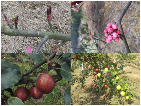 Different tissues and organs of ‘Red Zaosu’. (a) New shoots; (b) flowers; (c) mature fruits; (d) pear tree ‘Red Zaosu’ bearing red fruits and green mutants within a single tree.
