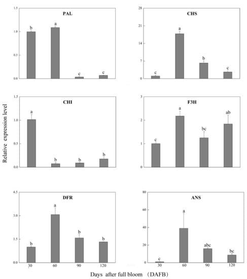 Expression patterns of the anthocyanin biosynthetic genes at different fruit development stages. Different lowercase letters indicate significant differences by ANOVA and Duncan’s test at p < 0.05.