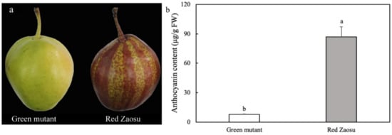 The anthocyanin contents in ripe fruit peels of ‘Red Zaosu’ and its green mutant from the same tree were measured. Reverse mutation in ‘Red Zaosu’ caused a severe color loss in the fruit skin, compared to the red-striped skin of ‘Red Zaosu’ (Figure 6a). As shown in Figure 6b, green mutants only contained 7.8 μg/g of FW anthocyanins, an amount noticeably lower than that in ‘Red Zaosu’ (87 μg/g FW).