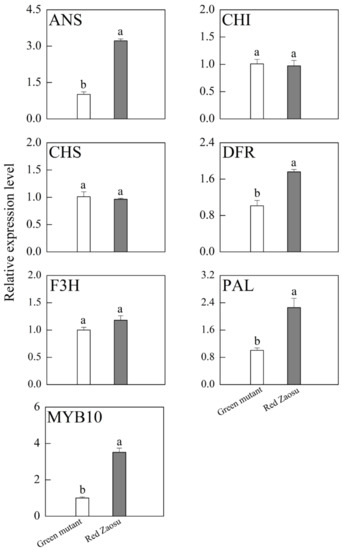 Expression patterns of the anthocyanin biosynthetic genes and MYB10 in ‘Red Zaosu’ and its green mutant. Different lowercase letters indicate significant differences by ANOVA and Duncan's test at p < 0.05.