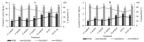 | Treatment | POM Proportion (%) | MAOM Proportion (%) | POM-C (g kg−1) | MAOM-C (g kg−1) | POM-N (g kg−1) | MAOM-N (g kg−1) | POM-C/N | MAOM-C/N |