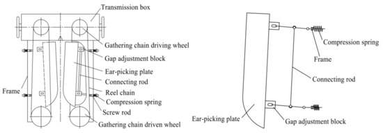 The corn plot kernel harvester requires to be equipped with an undamaged ear-picking device. This paper chose an ear-picking device combined with an ear-picking plate and snapping rolls in order to ensure a low breakage rate during the ear-picking process. If the gap between ear-picking plates is too large, corn ears will directly contact the snapping rolls, and if the gap is too small, thick stalk feeding and impurity discharge will be affected. Therefore, this paper develops a gap self-adjusting ear-picking plate, as shown in Figure 1.