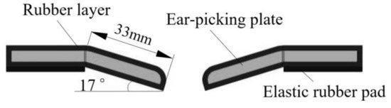 According to the reference [16], increasing the diameter at the point where the ear-picking plate and corn ears come into contact can reduce the instantaneous impact force. However, the flat plate or rounded edge is usually used in the existing corn ear-picking device that includes an ear-picking plate and snapping rolls. It has a small equivalent contact radius and cannot buffer the impact force generated during the ear-picking process. Therefore, the inverted right angle ear-picking plate of this paper has an inclination angle between the edge and horizontal plane. According to ear size measurement data, the bending length of the ear-picking plate is 33 mm, and the angle between the plate and horizon is 17°. Because the force area of the ear in relation to the ear-picking plate is greater than that of the plane plate, the impact force is insufficient to collide kernels. At the same time, two flexible treatments on the ear-picking plate parts have been made to reduce the damage of corn ears during the working process. As shown in Figure 2, the surface layer of the ear-picking plate is treated with glue for 3~5 mm, and an elastic rubber gasket is added under the ear-picking plate to further reduce the impact force received by corn ears in the working process. When the ear-picking device receives the impact of corn ears, the buffering effect of the elastic rubber pad allows it to convert the impact force of corn ears into the potential energy of the elastic rubber pad. The elastic rubber pad returns to its original shape after corn ears are picked, reducing kernels damage.