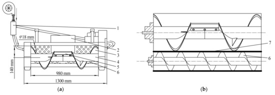 Cleaning system scheme of ear-picking device. 1. Pneumatic assisted seed cleaning system 2. Auger discharge port 3. Auger blades 4. Ear-conveying auger 5. Scraper 6. Sieve hole cleaning device 7. Auger-type kernel recovery device. (a) Top view, (b) Main view.