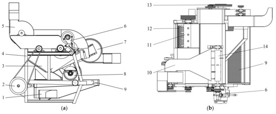 Structural scheme of threshing device. 1. kernel discharge port 2. Crank drive wheel 3. Inclined guide plate 4. Frame 5. Front fan 6. Clutch adjustment device 7. Rear fan 8. Core discharging device 9. Vibrating sieve 10. Front fan air supply channel 11. Threshing roller 12. Concave plate screen 13. Drive wheel 14. Spiral impurity removal device. (a) Main view, (b) Top view.