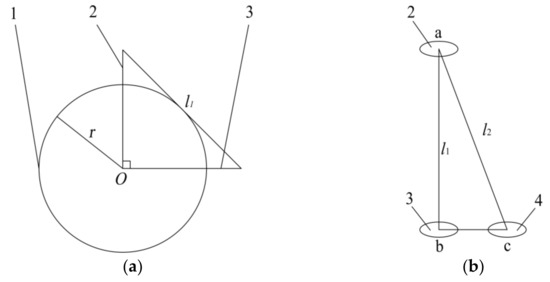 Mathematical model diagram. 1. Threshing drum 2. Threshing gear a 3. Virtual threshing gear b 4. Threshing gear c. (a) Cylinder section view, (b) Distribution of threshing teeth. Note: l1 is the shortest distance between two teeth tangent to drum body on the same section, mm; l2 is the distance between two teeth tangent to the drum body on the same spiral line, mm; r is the radius of the drum, mm.