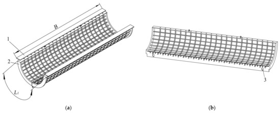 Concave sieve model diagram. 1. Fixed plate 2. Movable sieve 3. Slot hole. (a) Concave Screen Combination Diagram, (b) Concave sieve split diagram. Note: B is the width of concave, mm; L1 is the arc length of concave, mm.