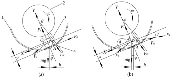 The force involved in threshing corn ears is more complicated. The single corn ear threshing process is taken as the research object under the ideal state of low feed rate, the force on the ear is translated to the barycenter, and the force analysis is shown in Figure 10a without considering the torque. Using the barycenter position O of corn ears as the origin, the connecting line between the barycenter of corn ears and the center of the threshing drum is the Y axis, the movement direction of corn is the positive direction of the X axis, and A is the contact point where the ear meets the concave sieve.