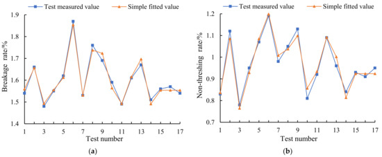 Distribution of test measured and fitted values. (a) Fitting curve of breakage rate, (b) fitting curve of non-threshing rate.