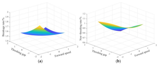 Figure 15a shows that the increase in the threshing gap causes the breakage rate to decrease significantly. This is because as the threshing gap widens, the effect of threshing elements on the ear was weakened, the grain crushing rate was reduced, the mutual squeezing and rubbing effect between ear was weakened, resulting in the non-threshing rate was increased. This is similar to the findings of Chen et al. [29]. The breakage rate decreases at first then increases as the forward speed increases. This is because, with the increase in the feeding amount, the ears cannot move in the axial direction in time, which will cause accumulation. It can be concluded that the effect of the threshing gap on the breakage rate is slightly higher than the forward speed from the response cloud map.