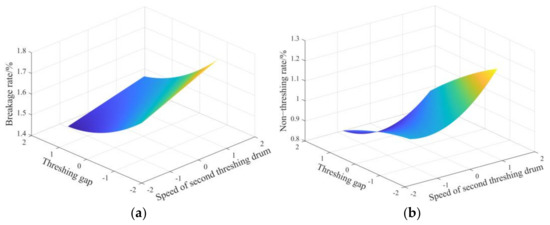 Figure 16a shows that the breakage rate decreases significantly as the threshing gap widens and increases as the threshing drum speed increases. This is because when the feeding amount is constant, the threshing gap increases and the beating frequency of corn will not increase rapidly with the increase in drum speed. It can be concluded that the effect of the threshing gap on the breakage rate is slightly higher than the speed of the threshing drum from the response cloud map.