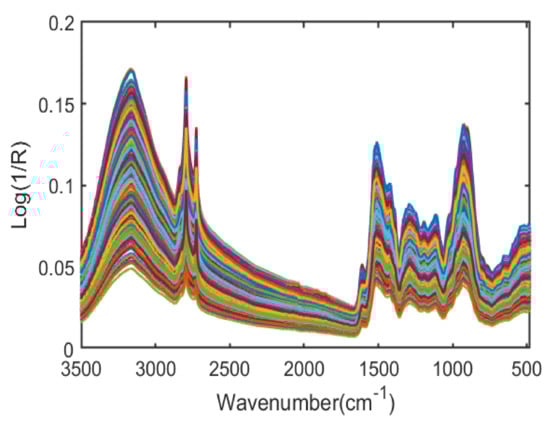 Nicolet 6700 (Thermo Scientific Co., Waltham, MA, USA) FT-IR spectrometer was used for the spectral measurement of moringa powder samples. The system was constructed in attenuated total reflectance (ATR) sampling mode and assigned with a detector made of deuterated triglycine sulfate (DTGS), with potassium bromide (KBr) as a beam splitter, which is all managed together by software made by OMINIC. For each particular sample, the spectra were acquired under the spectral range from 3500 to 800 cm−1. The number of scans was set to 32 per sample with 4 cm−1 intervals in order to reduce the background noise generated by the instrument. The spectral acquisition was performed based on the procedure explained by []. During the spectral acquisition, 10 replicates were selected for each of the 14 different concentrations. Thus, a total of 140 samples were measured using an FT-IR spectrometer.