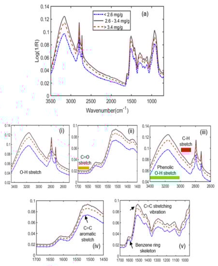 FT-IR SNV preprocessed spectra (a). (i–v) are the extended spectral regions related to different phenolics compounds.