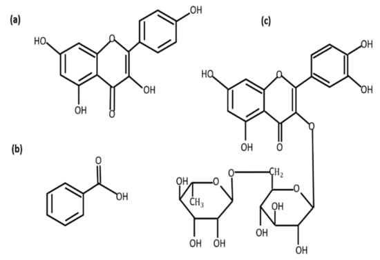 Chemical structures of (a) kaempferol, (b) benzoic acid, and (c) rutin.