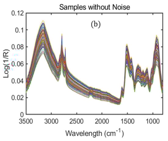 Figure 1 shows the raw spectra of moringa powder samples. The original FT-IR spectra consist of several overlapping peaks and noise generated by the instrument during spectral acquisition and, therefore, cannot provide meaningful information, which is sensitive to the phenolic compounds present in the measured samples. Thus, spectral preprocessing played a valuable role in enhancing the spectral quality and, therefore, provides more informative peaks related to critical chemical compounds present in the scanned samples. In this study, after applying standard normal variate (SNV) preprocessing, the high-quality spectral peaks were observed to eliminate unwanted noise and overlapping peaks.