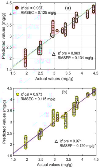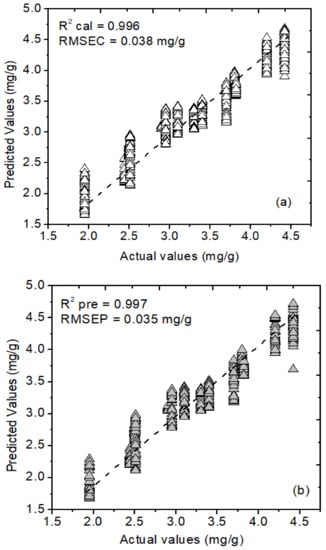 Statistical parameters, such as the coefficient of determination (R2) and root mean square error (RMSE), were used as a tool for model performance calculation. During the construction of the PLSR model, different preprocessing steps were employed. Compared to other preprocessing methods, SNV performed better and afforded a higher correlation value (R2) of 0.996 with a minimum error (RMSEC) value of 0.038 mg/g for the calibration dataset. In contrast, the R2 and RMSEP values for the prediction sets were 0.997 and 0.035 mg/g data. Figure 5a,b shows the actual and predicted values for the moringa powder samples, indicating a good agreement between actual and predicted concentrations.