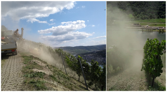 Viticulture is a traditional management system in many European regions, including (steep) slope terrain in southwestern Germany. As a crop adapted to specific climatic conditions, it is particularly common in southern European regions where it may exceed 8% of the total agricultural area, and reaches as far north as northern Germany and southern Scandinavia [44]. In vineyards and especially in steep slope vineyards, climate change-induced extended periods of drought and heat waves may lead to dry substrates and strong thermal winds, increasing the likelihood for wind erosion events with and without simultaneous tillage impact. Vineyards have been a topic of research concerned with the measurement [45] and modeling [46] of water erosion and redistribution of soil material by tillage [47] but have not been addressed in terms of wind erosion and dust emissions. Various tillage practices are applied during a cultivation cycle, among them tillage of the whole vineyard ground, mulching, and deep-tillage. The tillage of the area directly underneath the vine plants is an application increasingly used instead of chemical applications to reduce water competition and risk of diseases. This row-tillage is associated with lower amounts of applied herbicides and pesticides and is an increasingly used option due to an increasing percentage of conservatively and organically managed vineyards as well as a prospective glyphosate ban in Europe. The tested vineyard soils are assumed relatively stable against wind erosion due to an often nearly complete vegetation or stone cover and a generally high coarse soil content. Tillage operations may be initially responsible for large total amounts and the largest percentage of dust emissions originating from the vineyard site in a given period (Figure 1).