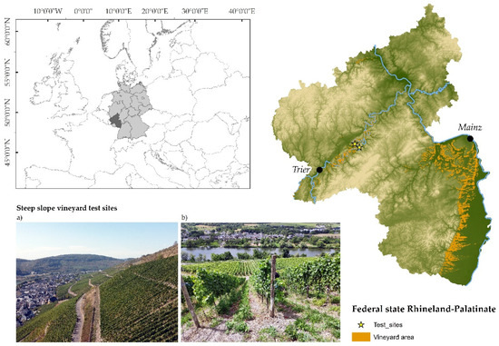 The investigations were carried out in the Moselle region on vineyards of the Service Center for Rural Areas (DLR) Rhineland-Palatinate (Figure 2). The wine region “Mosel” is famous for its characteristic steep slope viticulture and specific substrate. Due to reasons related to management, two vineyard sites were tested that resembled each other in key geomorphological, pedological and climatological characteristics. The steep-slope vineyards have a 25–35° inclination and are exposed south-southwest.