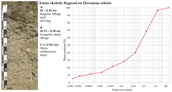 The soils are Eutric skeletic Regosols (WRB) with characteristic features of the regional vineyard substrates and developed on the main solifluction layer of Devonian schists. A specific horizon originating from irregular deep tillage is found up to a depth of 0.30 m. The soil type is very sandy loam (SI4) with 31% coarse soil fraction and 47% sand, 14% silt and 8% clay. The generally coarse substrate contains 22% particles < 63 µm, accounting for a comparably high percentage of material with a high sinking velocity potentially available for further transport in air (Figure 3).