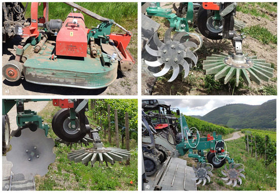 (a) Mulcher, (b) rotary-star tiller–finger hoe, (c) disc plough–finger hoe and (d) rotary-star tillers with equipped with MWAC samplers (marked).