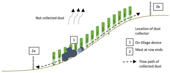 The test setup was designed to assess two modes of dust (Figure 5), the mobilized and the transported TSP. Dust collectors were attached directly to the cultivation device during cultivation in order to measure the total mobilized sediment hurled up and floating in the close vicinity of mobilization (Figure 5 (1)). In order to measure material drifting over longer distances, masts with five MWACs at heights 0.1, 0.2, 0.4, 1.0 and 1.8 m were positioned at the end of each row that was being tilled (Figure 5 (2)). Substrate material was caught if it was released and dissipated slope-parallel.