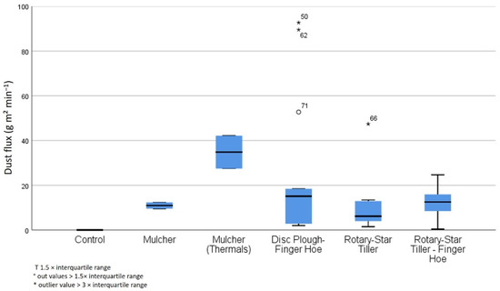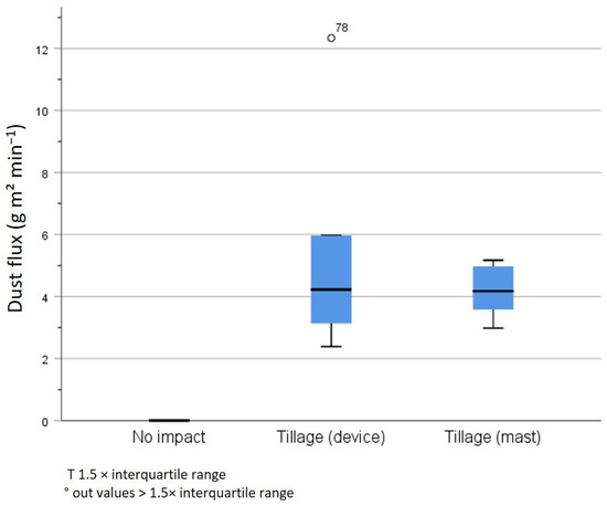 Measurements from each tillage operation were used as a mass collected per minute (g min−1), and the horizontal flux (g m2 min−1) was calculated by dividing this value by the total sampling area of 0.000050265 m2 (inlet area for one inlet). The data were tested for normality (K-S/S-W), Spearman’s rank coefficient was performed, mean values were derived, and boxplots were generated by means of SPSS Statistics 27.0 [48].