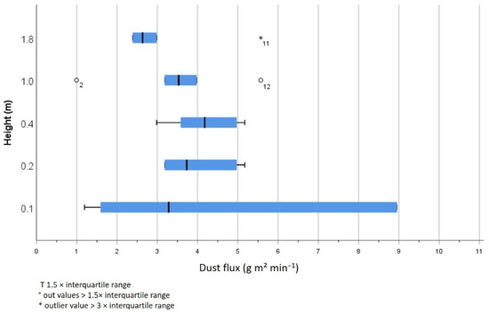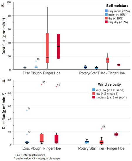 These two parameters are shown as boxplots for both tested tool combinations in Figure 7a,b. Relative categories for moisture and wind velocity were established from the available data set. Concerning both tools analyzed together, a comparison of tests according to the relative category of moisture (very dry < 5%, dry < 10%, moist < 15%, very moist ca. 20%) revealed for both the highest fluxes related to the dry categories (20.9 and 23.3 g m2 min−1 for very dry and dry, respectively) and the lowest values related to the moist categories (3.5 and 3.8 g m2 min−1 for very moist and moist, respectively) (Table 4). Concerning relative wind velocity categories (very low < 1 m s−1, low < 2 m s−1, medium ca. 3 m s−1), lower values were related to lower categories (8.1 and 10.6 g m2 min−1 for low and very low, respectively) and highest values related to the medium category (17.9 g m2 min−1) (Table 4).