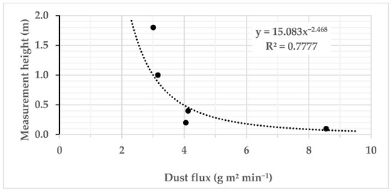 Mean vertical distribution measured at masts tended to decrease with height described by a power function but showed some differences from case to case (r2 = 0.77). This distribution is commonly attributed to saltation, which is the most important transport mechanism by far and decreases with height up to ca. 1 m (e.g., [54]). Since the test conditions presented here did not allow for saltation, the vertical transport pattern resulted not from processes of wind erosion but was related to mechanical impact and dissipation processes. A clue could be found by considering the peak in median collected material at 0.4 m collection height, which corresponded to the area of action related to the applied tillage tool.