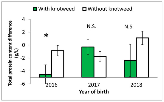 Differences in the total protein content in equine blood between the beginning and the end of Experiment 2, shown for stallions of the three age groups (born in 2016, 2017 and 2018) fed and not fed knotweed. Means ± SEM. Statistically different values at p ≤ 0.05 are marked with *. N.S. = non-significant difference.
