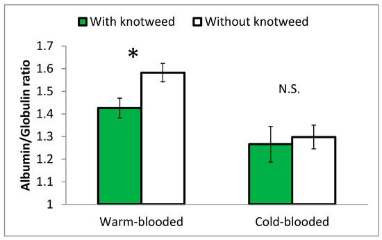 Albumin/globulin ratio in the blood of warm-blooded and cold-blooded stallions fed with and without knotweed, Experiment 1. Means ± SEM. Statistically different values at p ≤ 0.05 are marked with *; N.S. = non-significant difference.