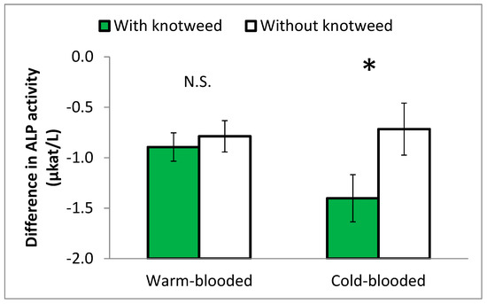 Differences in equine ALP activity between the beginning and the end of Experiment 1 among horses fed and not fed knotweed. The warm-blooded and cold-blooded breeds were compared. Statistically different values at p ≤ 0.05 are marked with *. N.S. = non-significant difference.
