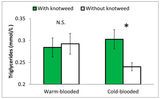 Levels of triglycerides at the end of Experiment 2 in the blood of horses fed and not fed knotweed. Warm-blooded and cold-blooded horses were compared. Statistically different values at p ≤ 0.05 are marked with *. N.S. = non-significant difference.