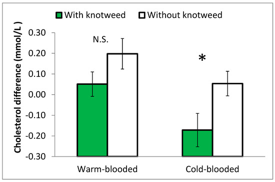 The differences in the blood cholesterol levels of 2- and 3-year-old stallions fed with and without knotweed from the beginning to the end of Experiment 2, comparing warm-blooded and cold-blooded. Statistically different values at p ≤ 0.05 are marked with *. N.S. = non-significant values.