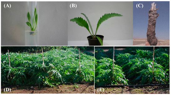 - El Boullani, R.; Elmoslih, A.; El Finti, A.; El Mousadik, A.; Serghini, M.A. Improved in Vitro Micropropagation of Artichoke (Cynara Cardunculus var. scolymus L.). Eur. J. Sci. Res. 2012, 80, 430–436. [Google Scholar]