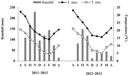 During the two-year experiments, daily temperature and rainfall were measured by a meteorological station located about 150 m of the field. The total rainfall in season I fell mostly between September and February (856 out of 944 mm), while season II was rather unusual, since the rainfall amount was low (502 mm), and 70% of it fell between September and November (Figure 2). Except in December, the higher mean maxima temperatures were recorded in the season II than in the season I, as well the lower mean minima temperature in December (6.9 vs. 8.2 °C) (Figure 2).