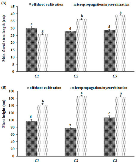 The latter morphological traits have also showed significant ‘genotype × propagation method’ interaction (Table 2). In particular, the micropopagated/mycorrhized clones reported the highest and lowest main floral stem length, with values of 39.4 (‘C3’) and 26.3 cm (‘C1’), respectively, respect to offshoots cultivated ones (Figure 3A). On the other hand, an effect of micropropagation, in conjunction with the provision of mycorrhiza, was to induce a rise in the plant height of the plants, achieving the maximum increase in ‘C2’ (+53%) (Figure 3B).