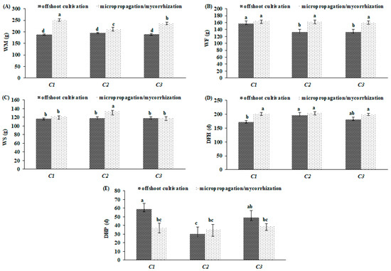 Bio-agronomical traits in clone of globe artichoke plants as affected by ‘genotype × propagation method’. Different letters indicate significance at Fisher’s protected LSD (least significant difference) test (p ≤ 0.05). Vertical bars indicate ± standard deviation. WM, main head fresh weight (A); WF, first order head fresh weight (B); WS, second order head fresh weight (C); DFH, first harvest (D); DHP, harvest period (E).