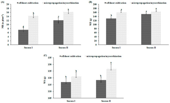 As shown by the ANOVA, WF, WS, and NH were also associated with a significant ‘propagation method × season’ interaction (Table 1). Going from season I to season II, both offshoots cultivation and micropopagated/mycorrhized plants consistently increased their NH (+39 and +12%, respectively) (Figure 3A). With reference to WF and WS, offshoots cultivated and micropopagated/mycorrhized plants exhibited a different behaviour. Passing from season I to season II, WF revealed significant differences only within offshoots cultivated plants. The same applied to the WS in the case of micropopagated/mycorrhized plants (Figure 5B,C).