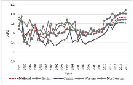 - Under the dual constraints, APE showed a stable upward trend with fluctuation (mainly between 1978 and 2000), but still at a low level overall with much room for improvement. Region-wise, the northeastern region had the highest APE and higher growth than the central and western regions. However, the gap was narrowing between the central and western regions and other regions. The APE evolution in China showed a bimodal distribution with a narrowing gap between the heights of the two peaks, i.e., no manifestation of polarization. The intra-regional differences widened and then narrowed, while the spatiotemporal evolution characteristics were different among different regions.