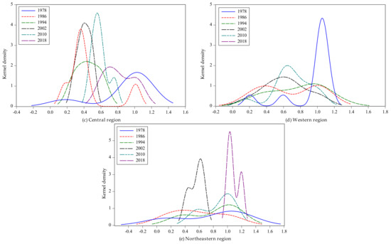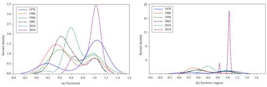 To further explore the differences in APE clustering evolving over time among provinces, a non-parametric Kernel density function of Gaussian distribution [49] was used, and six years, 1978, 1986, 1994, 2002, 2010, and 2018, were selected as observation time points for Kernel density estimation to obtain the distribution status at different time points (Figure 2). The height and width of the peak reflect the degree of agglomeration and the magnitude of differences in each province, respectively, and the number of peaks reflects the degree of polarization [50]. APE under dual constraints shows an overall “bimodal” distribution from left to right and does not show polarization. It generally shows an upward trend but also has fluctuations. With the year 2000 as the dividing point, during 1978–2000, the height of the right peak has experienced the process of “falling and rising,” and the width first becomes large and then becomes small, indicating that APE showed a trend of fluctuations and the reduction in regional differences, consistent with the results of the aforementioned feature analysis. During 2000–2018, the height of the right peak increases and the width decreases, implying that APE stably improves and inter-regional difference gradually decreases. The overall APE under climate change shows a trend of first fluctuating and then stably increasing over time. Most provinces gradually change from “similar levels of high or low agglomeration” to high levels of agglomeration, and the gap among provinces in APE tends to narrow.