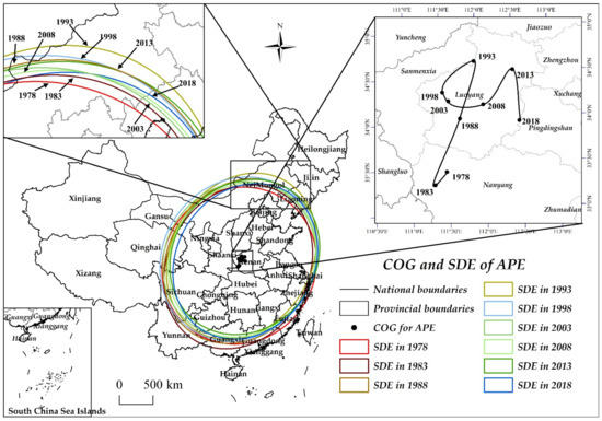 In terms of the changes in the elliptical shape, the major axis was extended from 1189.957 km in 1978 to 1202.703 km in 2018, while the minor axis was shortened from 1119.570 km in 1978 to 1016.121 km in 2018, and the mean shape index (minor axis/major axis) in 1978, 1993, 2003, and 2018 was 0.941, 0.805, 0.912, and 0.845, respectively. Assessing by periods, the mean shape index decreased from 0.941 to 0.805 between 1978 and 1993, increased from 0.805 to 0.912 between 1993 and 2003, and decreased again from 0.912 to 0.845 between 2003 and 2018. Thus, the mean shape index of the ellipse went through a series of downward, upward, and downward trends resembling an inverted n shape. However, the mean shape index was decreasing overall, and the ellipse resembled less and less of a circle. The north-south direction became the major axis and expanded, while the east-west direction contracted, indicating that APE tended to be imbalanced in the north-south and east-west directions, and the COG mainly transferred northward in the north-south direction. The azimuth angle of the ellipse varied slightly from 29.592° to 39.032° and showed a series of decreasing, increasing, and decreasing trends. The azimuth angle shifted 6.714° to the east between 1978 and 1993, 8.514° to the north between 1993 and 2003, and 6.596° to the north by east between 2003 and 2018. Overall, the spatial distribution of APE showed a northeast-southwest pattern, and the contraction of the minor axis in the east-west direction reflected the east by north trend in the north-south direction.