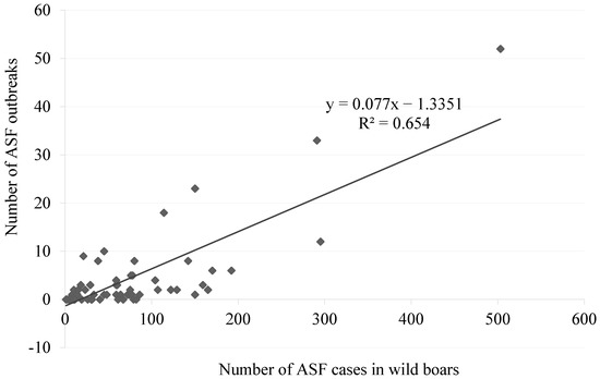 Based on the regression analysis presented in Equation (2), it was confirmed that there is a causal relationship between the intensity of ASF cases (expressed in wild boars in a given poviat) and the number of ASF outbreaks in domestic pigs (Figure 1).