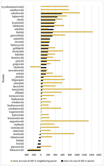 However, the analysis is somewhat limited, because it is not possible to precisely determine the moment of the first appearance of ASF in wild boars in a given poviat. In some circumstances, their detection is decided by chance (e.g., a road accident in Lubusz Voivodeship) and the presence of the virus in a given area precedes the date of its official confirmation. This especially applies to areas that are very distant from the places where cases of diagnosed ASF occur in wild boars and where there is an ASF outbreak in pigs.