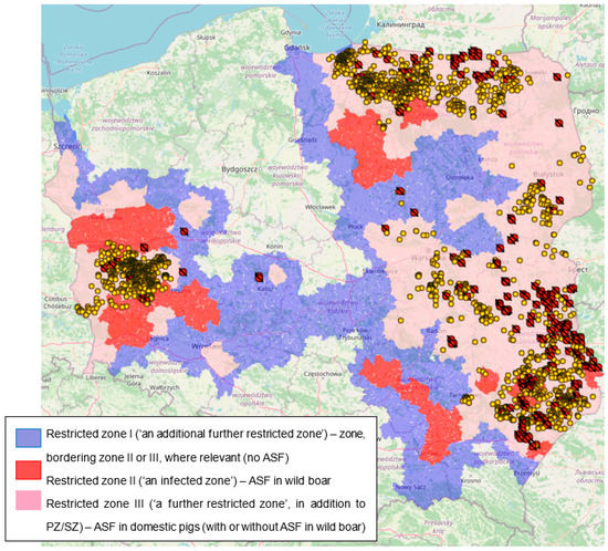 With the spread of ASF cases in wild boards, larger and larger areas of the country are covered by restrictions resulting from the application of regionalisation principles in Poland. It consists of demarcating ASF risk areas and subjecting them to appropriate restrictions depending on their disease risk. The restrictions mainly concern: the movement of pigs from and to holdings, slaughterhouses, veterinary supervision, appropriate transport conditions, and appropriate documentation. There are three types of ASF-related areas [29]. Their boundaries at the end of December 2020 are shown on Scheme 2.