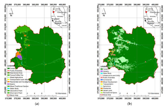 Figure 2. Land use information of the Cameron Highlands provided by (a) DOAM (adapted from Ref. [21]) and (b) PLANMalaysia (adapted from Ref. [24]).