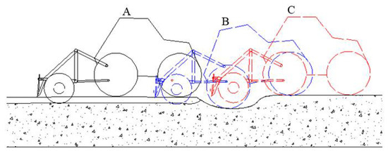 Schematic of rotary burying depth control. Note: point A is a flat area of the field, point B is the uneven area where the rear wheel reaches, and point C is the uneven where the rotary tiller reaches.
