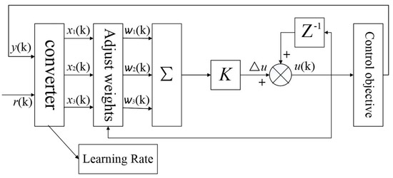 The proportion, integration, and differentiation of the single neuron PID controller adopt learning rates ηP, ηI, and ηD, respectively, to realize the adjustment of different coefficients. The adaptive control structure is shown in Figure 8, where Z−1 is the control quantity of the last moment.